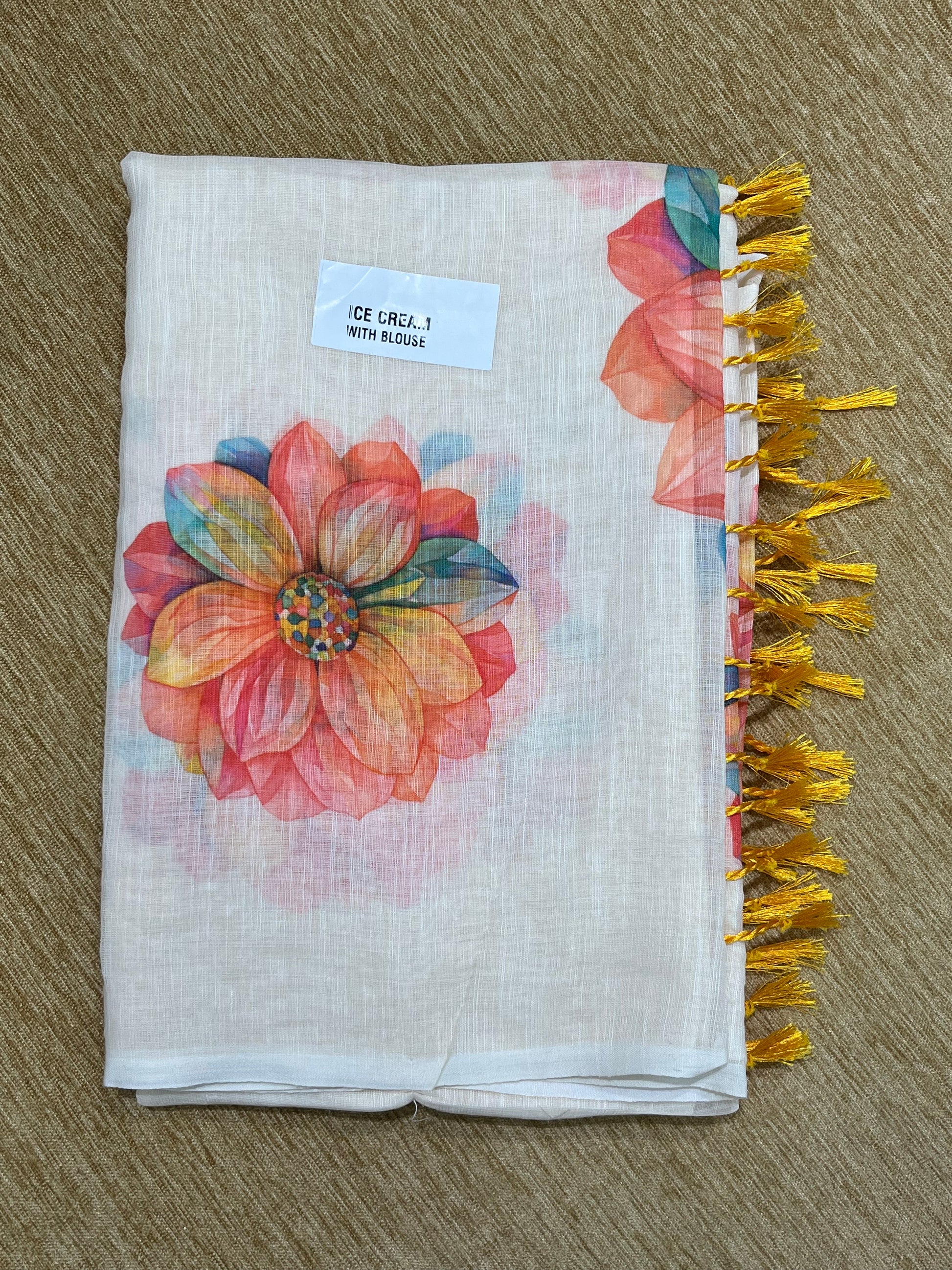 Crafted from a soft, breathable linen-type fabric, this saree is adorned with a high-definition digital floral print that radiates elegance. The lightweight feel ensures all-day comfort, while the beautiful tassels on the pallu add a graceful, stylish finish. Ideal for festive occasions, casual outings, or workwear—this saree brings effortless sophistication to any look.