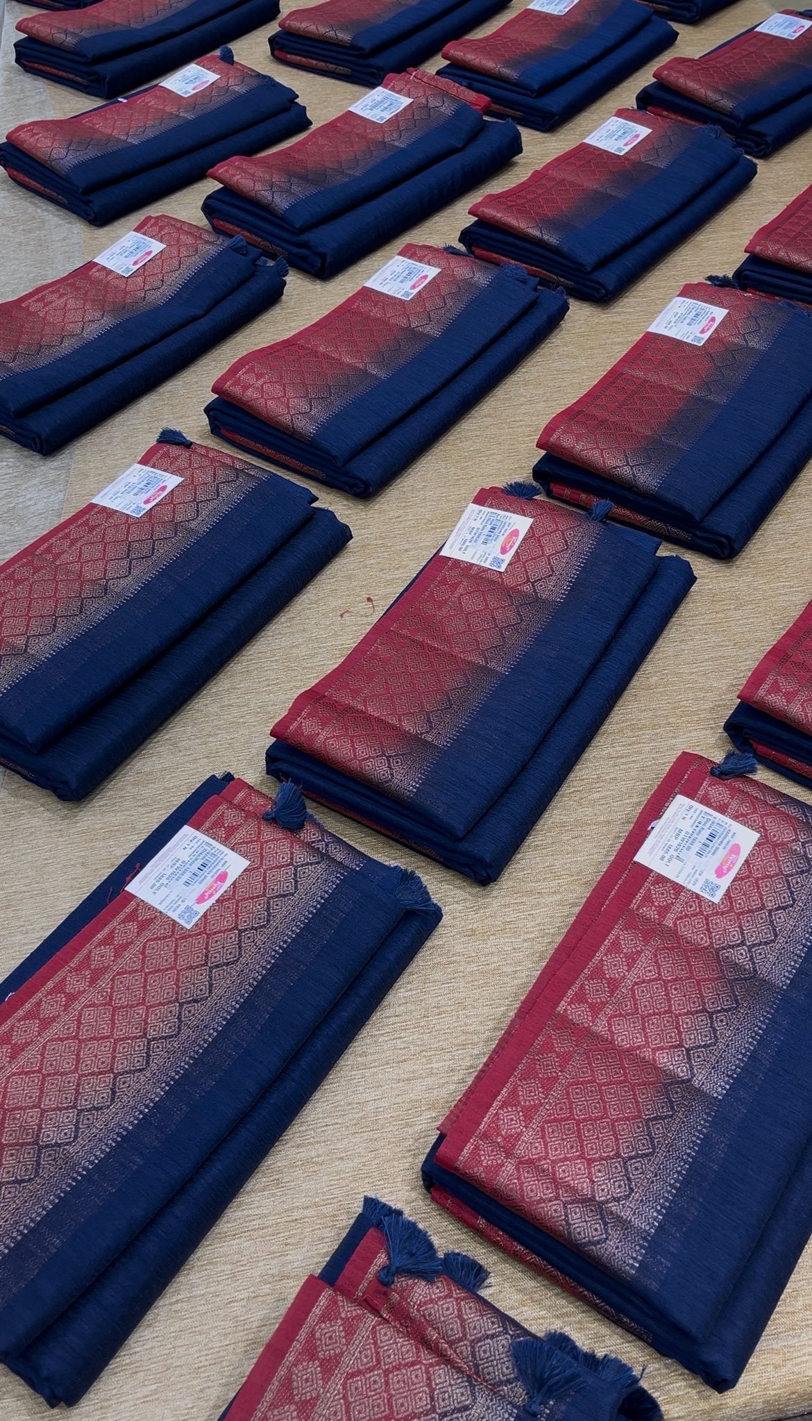 The Saree is a semi-jute saree with a navyblue body and a red shade contrast border.The border features neem zari design .The Pallu ( the decorative end of saree) is adorned with beautiful tassels .