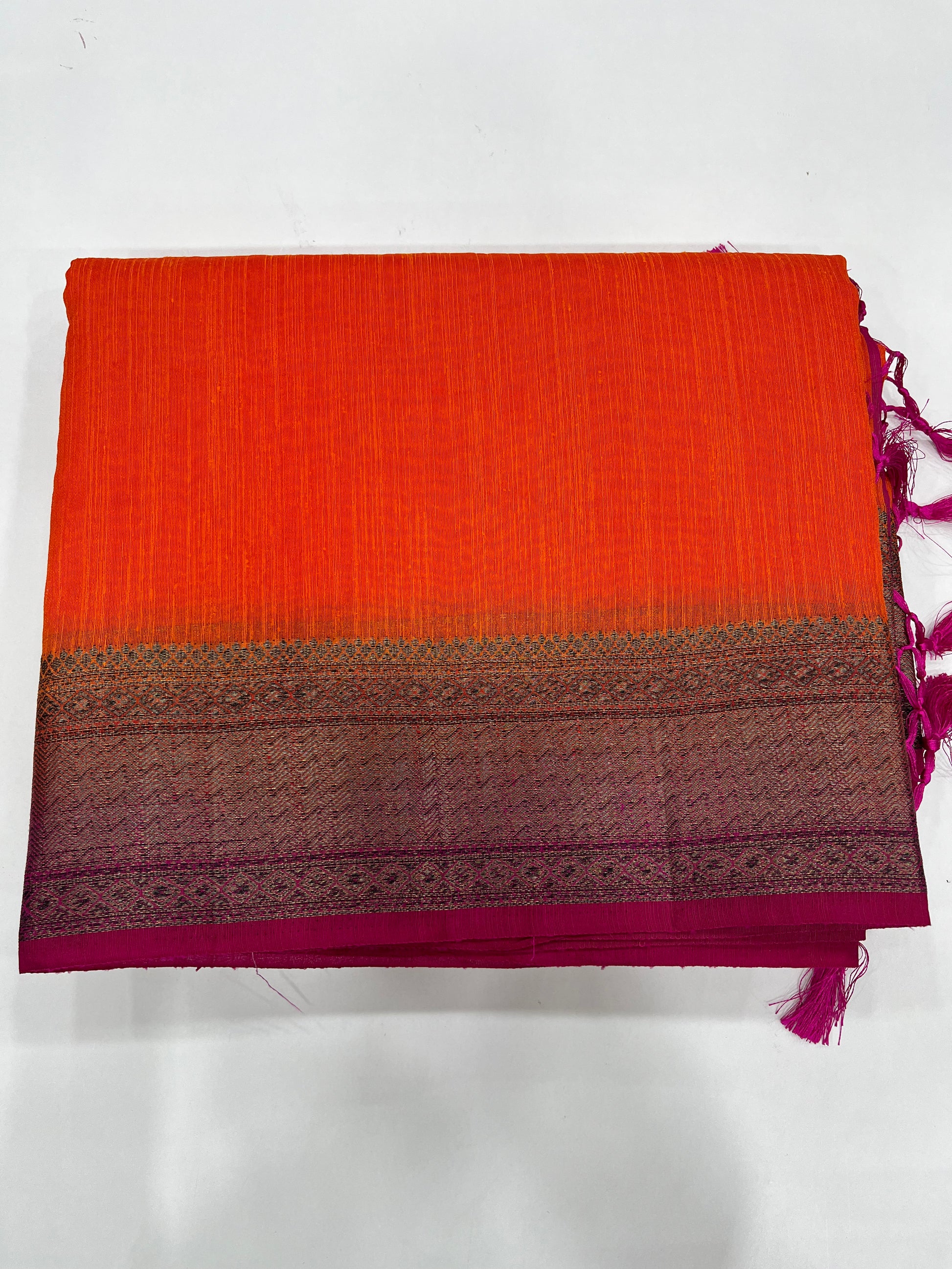 The Saree is a semi-jute saree with a orange body and a pink shade contrast border.The border features neem zari design .The Pallu ( the decorative end of saree) is adorned with beautiful tassels .