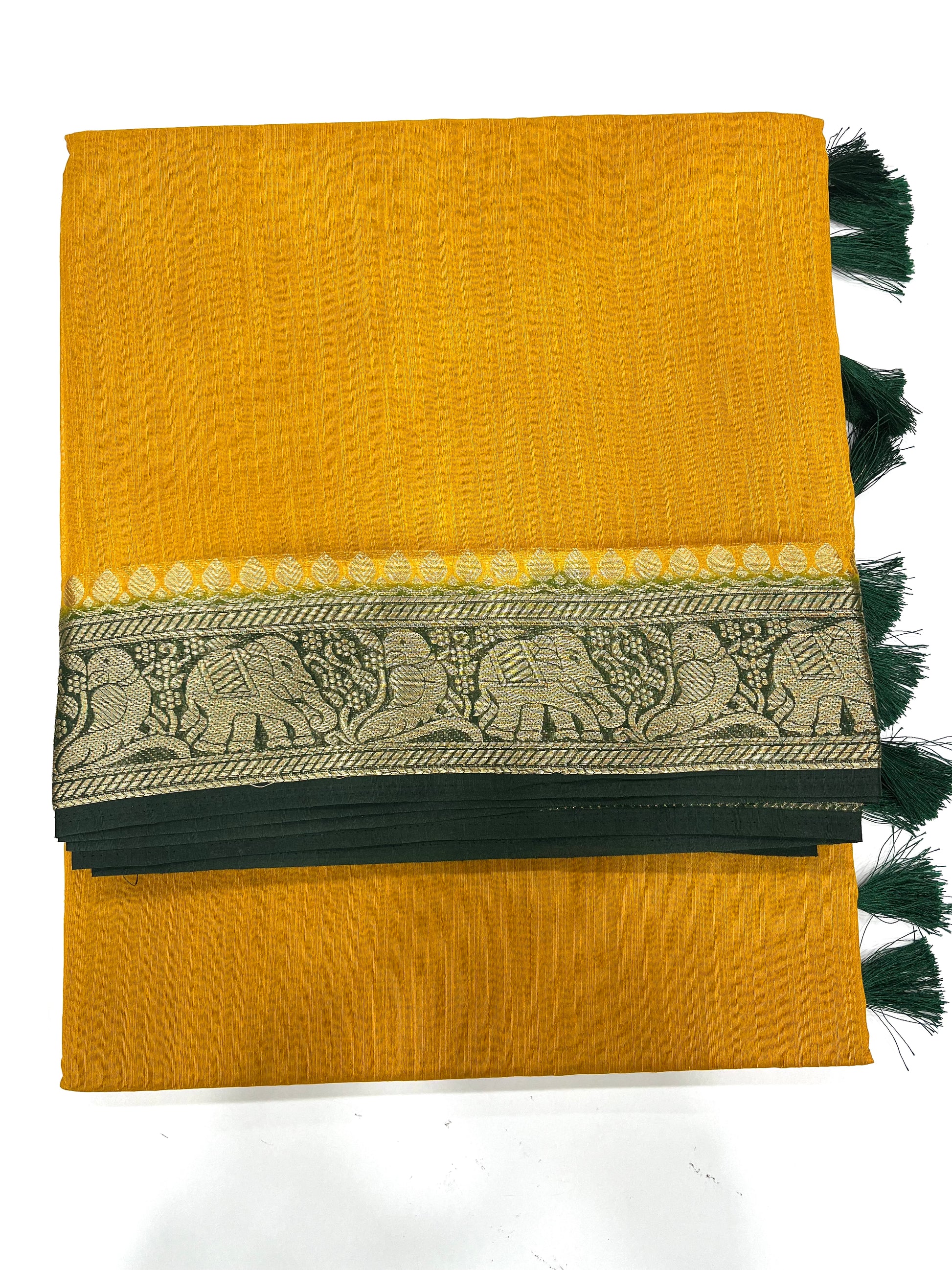 The Saree is a semi-jute saree with a golden yellow body and a green shade contrast border.The border features elephant and parrot design .The Pallu ( the decorative end of saree) is adorned with beautiful tassels .