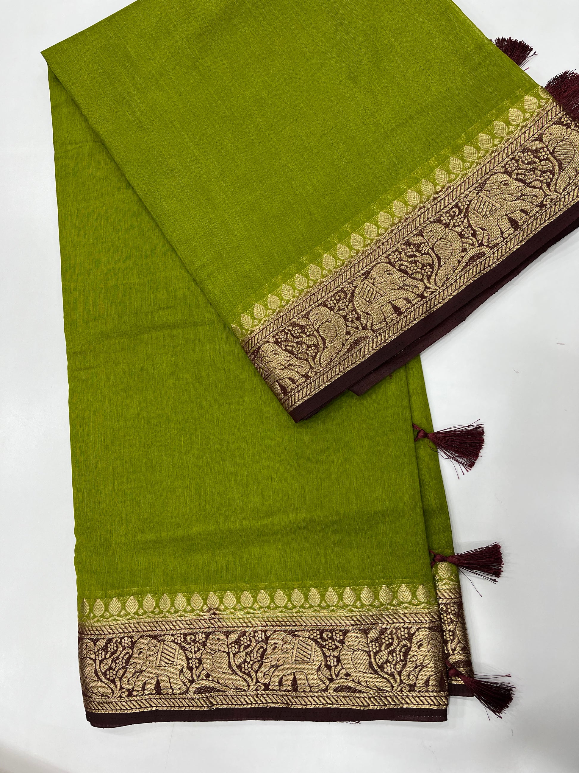 The Saree is a semi-jute saree with a green body and a meroon shade contrast border.The border features elephant and parrot design .The Pallu ( the decorative end of saree) is adorned with beautiful tassels .